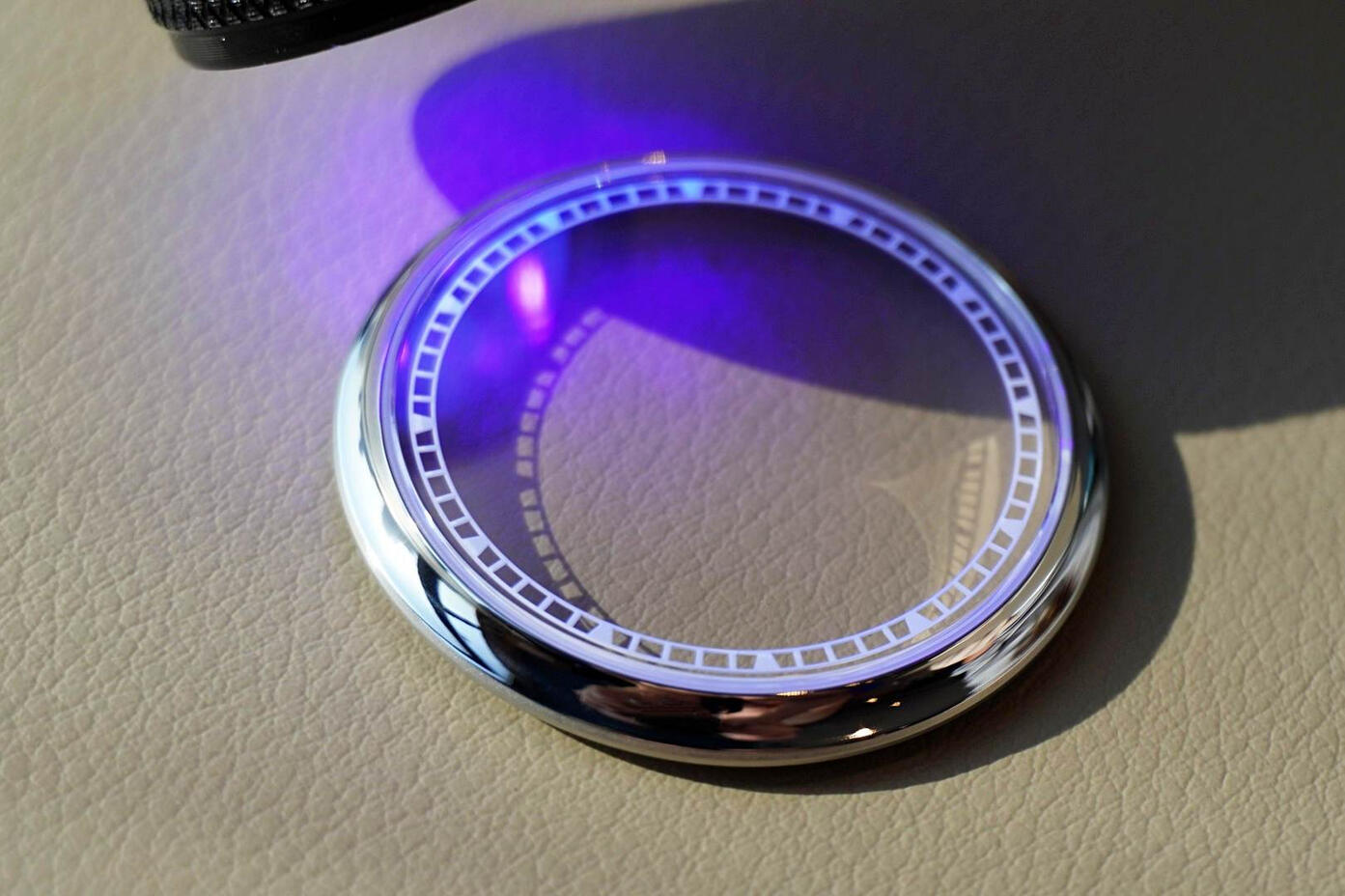 To create greater depth and three-dimensional effect, the original Deep Space series incorporated a printed minute ring on the underside of the front sapphire. Considering an evolution of this design language, we want the Deep Space Blue to include discrete and practical luminous elements to fully modernise the theme.Our pursuit of fluid design encouraged us to develop a new way of integrating a luminous minute ring within the front sapphire - a method consistent with our innovative and integrated, two-part hands design.Our idea was to engrave into the front sapphire, removing the extremely hard material accurately and without breaking the piece as a whole.Once achieved, the frame of the minute ring is filled with Grade X1 Super-Luminova over multiple applications, to establish an even and uniform result between two completely different materials.In daylight the minute ring is bright white in colour, and appears to hover, suspended inside the sapphire. Its elevated position can cast a dynamic shadow onto the dial below, depending on the time of day. In low light the minute ring's white colour dissipates into a luminous blue glow.To limit the reflection and glare of the highly polished sapphire glass, its underside is also applied with five layers of an anti-reflective coating - ensuring the best possible view of the dial and display of time.