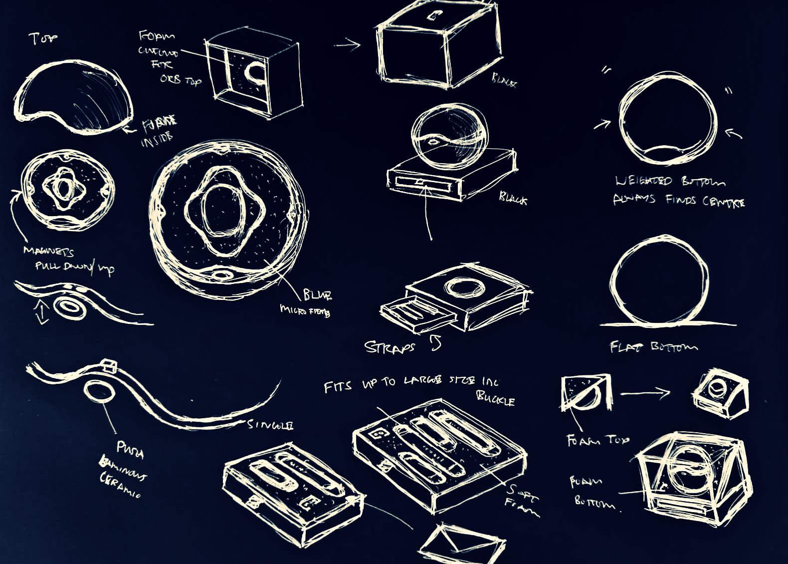 Initial sketches of the silver spheres that will transport the Deep Space Blue watches.The next step is to develop them in 3D.