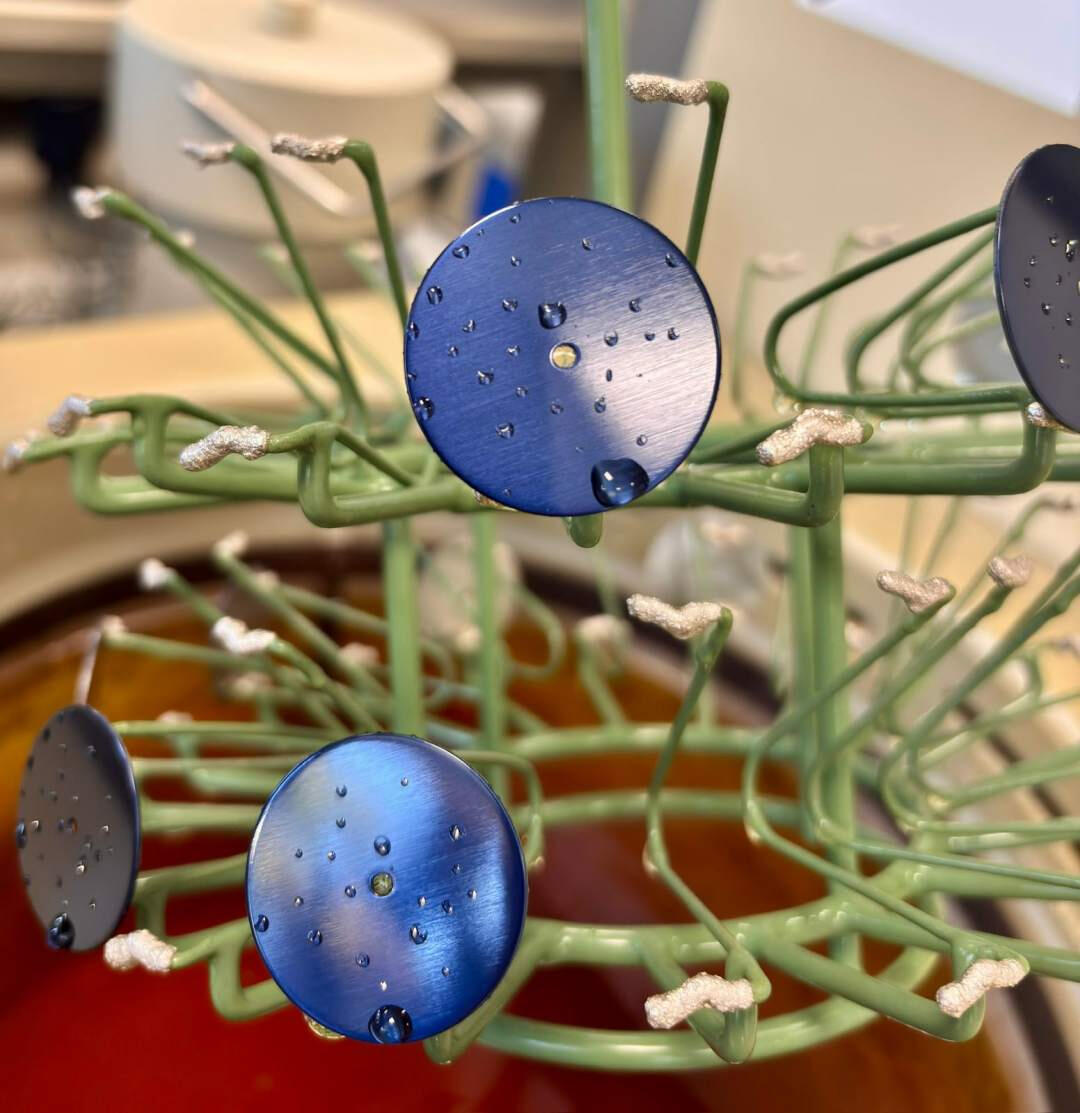 To change the raw titanium to a deep blue colour, the dial is put through an electrochemical process called anodisation. Using different electric voltages, an array of different colours can be created.