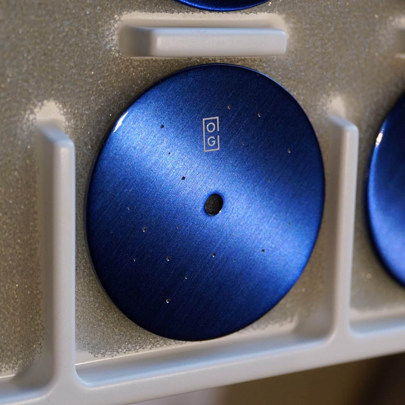 Our friends at HOD Watch workshop have created some further prototype dials. The pattern of stars as well as the O.G mark have all been engraved by hand.You can see in the video just how dynamic the colour is - brighter light turns the dial to an atmospheric blue, however most of the time it displays a deep and darker tone that strongly contrasts with the stars and O.G mark.
