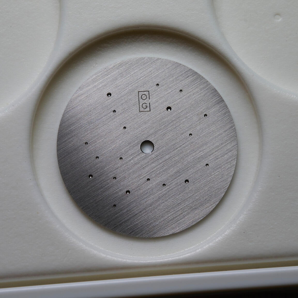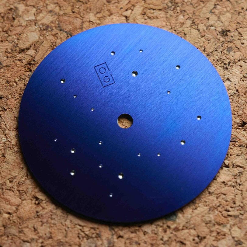 Our friends at HOD Watch workshop have created some further prototype dials. The pattern of stars as well as the O.G mark have all been engraved by hand.You can see in the video just how dynamic the colour is - brighter light turns the dial to an atmospheric blue, however most of the time it displays a deep and darker tone that strongly contrasts with the stars and O.G mark.